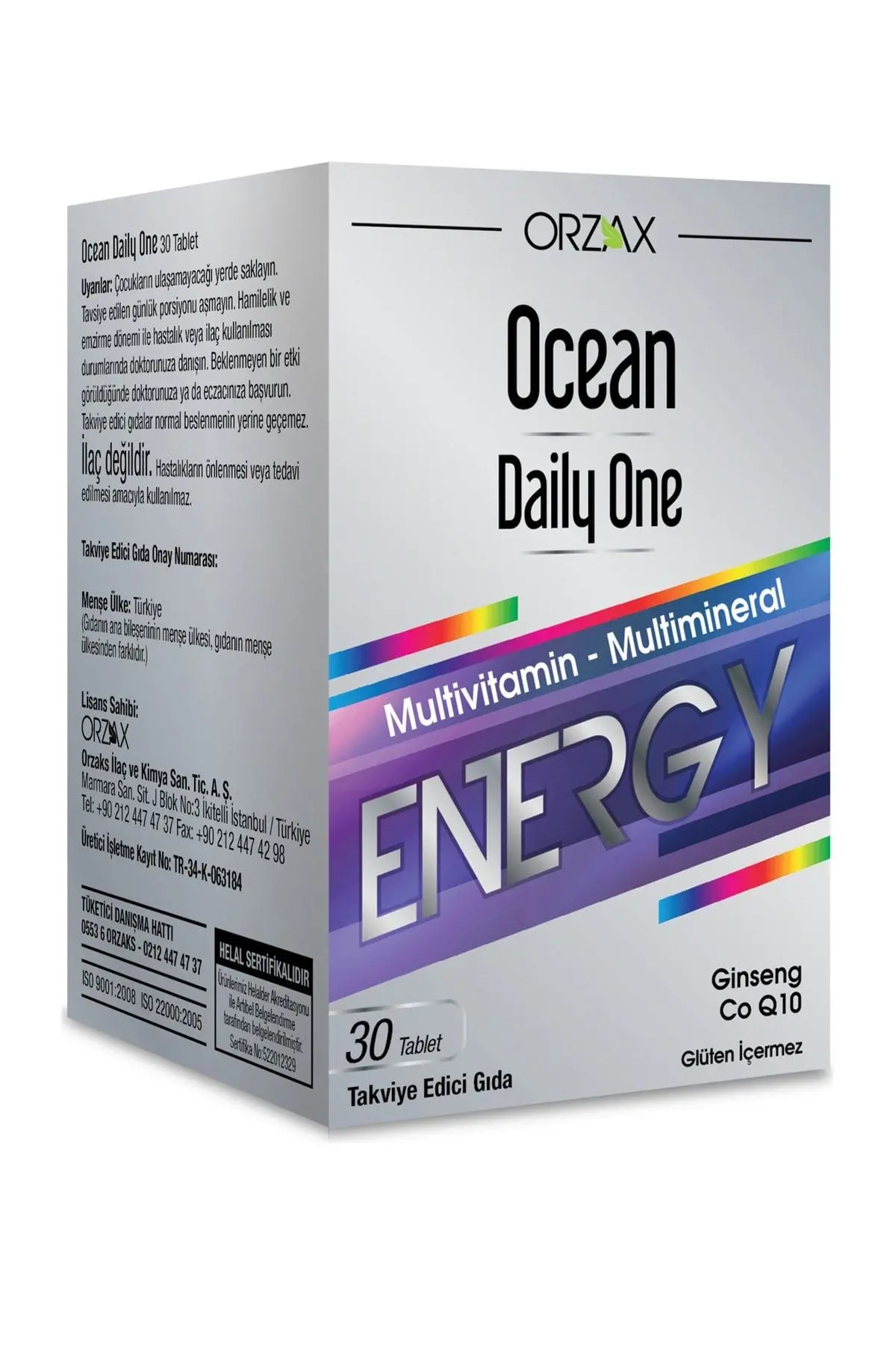 Ocean DAILY ONE ENERGY 30 Tablet ürünümüzün tanıtım ve satış sayfasıdır. Ürünlerimiz direkt üretici ya da ithalatçılardan temin ettiğimiz orijinal ürünlerdir. OCEAN DAILY ONE ENERGY 30 TABLET 30 Tablet Multivitamin-Multimineral Ocean Daily One Energy içeriğindeki panax ginseng, koenzim Q10, K2 vitamini ve 12 vitamin, 10 mineral ile hazırlanmış multivitamin ve mineral desteğidir. İçeriğindeki ginseng fermentasyon tekniği ile ekstrakte edilmiştir. Koruyucu ve renklendirici içermez. ADI MİKTARI *BRD Kalsiyum200 mg%25 C Vitamini80 mg%100 Magnezyum60 mg%16 Panax Ginsengi50 mg** Demir14 mg%100 B 3 Vitamini 16 mg NE***%100 E Vitamini12 mg%100 Koenzim Q1010 mg** Çinko10 mg%100 B 5 Vitamini 6 mg %100 Manganez2 mg%100 B 2 Vitamini 1,4 mg %100 B 6 Vitamini 1,4 mg %100 B 1 Vitamini 1,1 mg %100 Bakır1 mg%100 A Vitamini 800 µgRE***** %100 Folik Asit200 µg%100 İyot150 µg%100 Selenyum55 µg%100 Molibden50 µg%100 Biotin50 µg%100 Krom40 µg%100 K 2 Vitamini 25 µg %33 D 3 Vitamini 10 µg %100 B 12 Vitamini 2,5 µg %100 *BRD: Beslenme Referans Değeri **Beslenme referans değeri yoktur. ***NE: Niasin eşdeğeri. ?****-TE: ?-Tokoferol eşdeğeri. *****RE: Retional eşdeğeri. Kullanım Önerisi: Günde 1 tablet tüketilmesi önerilir.