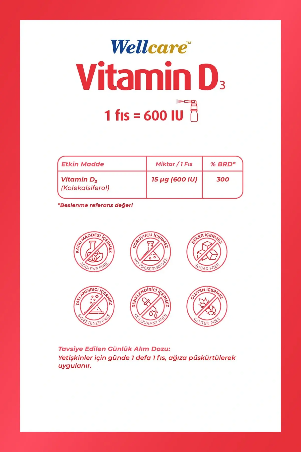 - Wellcare Vitamin D3 600 Iu 5 ml Sprey, günlük vitamin ihtiyacını karşılayan etkili bir gıda takviyesidir. D3 vitamini desteği sağlar.